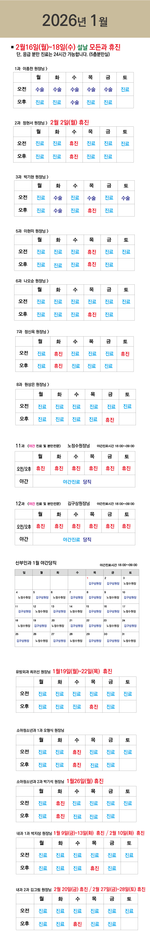 안녕하세요. 나리여성병원입니다. 2026년 새해 1월 진료일정을 안내드립니다. 예약 및 내원 시 참고 부탁드리며, 올 한 해도 산모와 가족의 건강한 시작을 함께하겠습니다. 감사합니다.