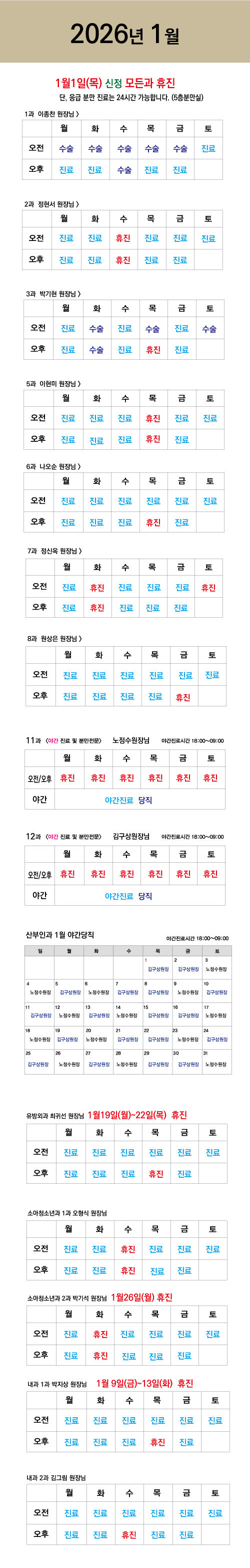 안녕하세요. 나리여성병원입니다. 2026년 새해 1월 진료일정을 안내드립니다. 예약 및 내원 시 참고 부탁드리며, 올 한 해도 산모와 가족의 건강한 시작을 함께하겠습니다. 감사합니다.